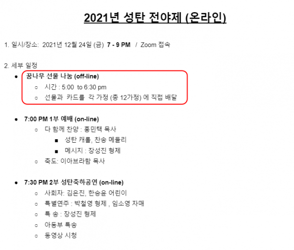 1, 12월 24일(금)에 예정 되었던 성탄전야제는 우리 어린이들의 건강을 위해서 online 으로 하기로 했습니다.