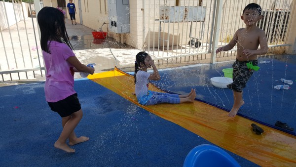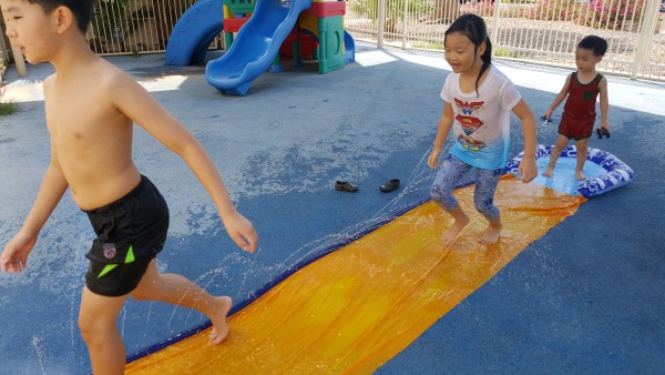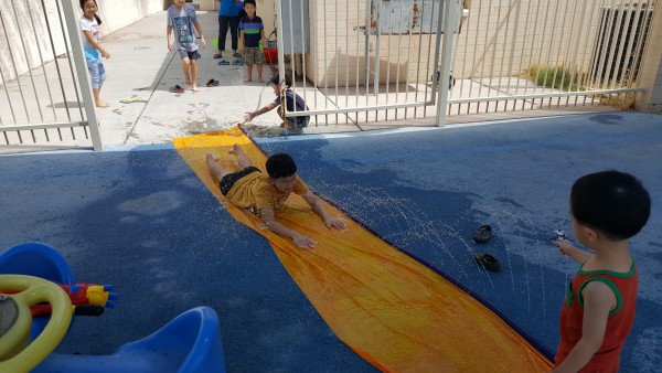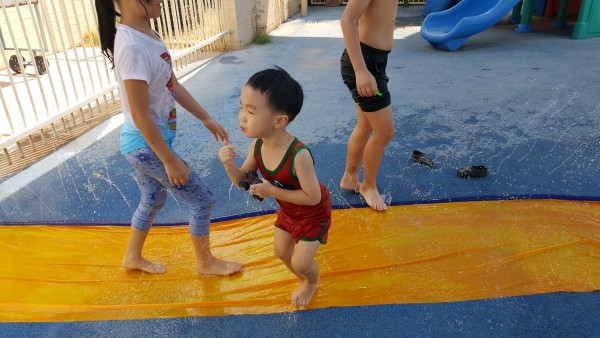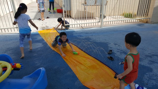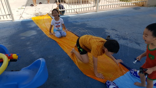 그리고 오늘 주일아동부 예배 2부 순서로 물총싸움, 워터 슬라이딩 등 놀이를 했습니다.