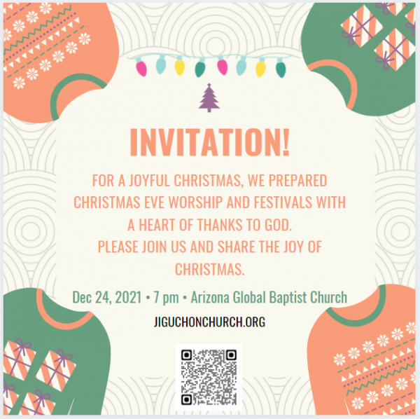 On Friday, December 24, 2021, from 7:00 - 9:00 p.m. we will have a Christmas Eve Worship Service along with some festivities. We have prepared a Candlelight Service / Congratulatory Performances / Gift Exchange and others! Please join us!